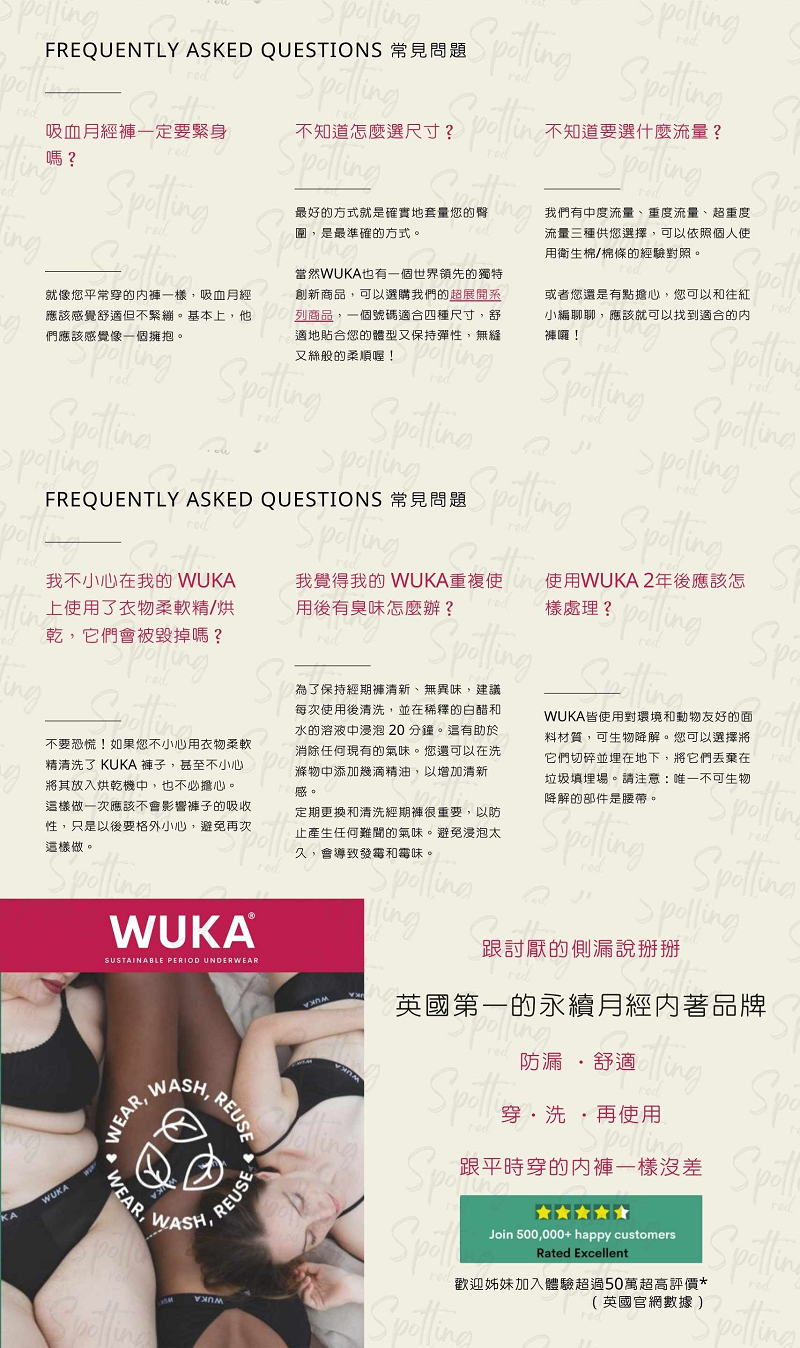 ●機洗:將您的 WUKA 與類似的深色衣服一起洗滌,放在洗衣袋中並使用冷水翻面洗滌。不要使用衣物柔軟精。